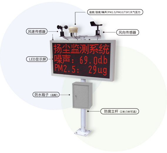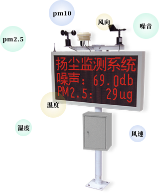 基于物聯(lián)網(wǎng)及人工智能技術(shù),利用無線傳感器技術(shù)和激光粉塵測(cè)試設(shè)備,實(shí)現(xiàn)揚(yáng)塵在線監(jiān)控,可以監(jiān)測(cè)PM2.5,PM10,噪音,環(huán)境溫度,環(huán)境濕度,風(fēng)速風(fēng)向等各項(xiàng)指數(shù)。