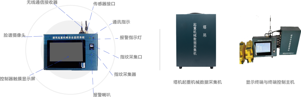 監(jiān)控尺寸為25×20×8.5(cm),接收數(shù)據(jù)采集器數(shù)字信號之后進行相應的處理。最終將塔吊的工作狀態(tài)生動顯示在7寸顯示屏上,并且終端所有操作均通過觸摸完成。終端可以采集塔吊、升降機操作人員的指紋信息,并能與監(jiān)控平臺備案的指紋數(shù)據(jù)對比,確定操作人員的身份,為進一步完善操作人員的管理奠定了基礎(chǔ)。針對塔吊駕駛員考勤定時拍照,確定是否為本塔吊駕駛員操作,可以不定時的進行遠程巡檢,避免其他非認證駕駛員違規(guī)操作。